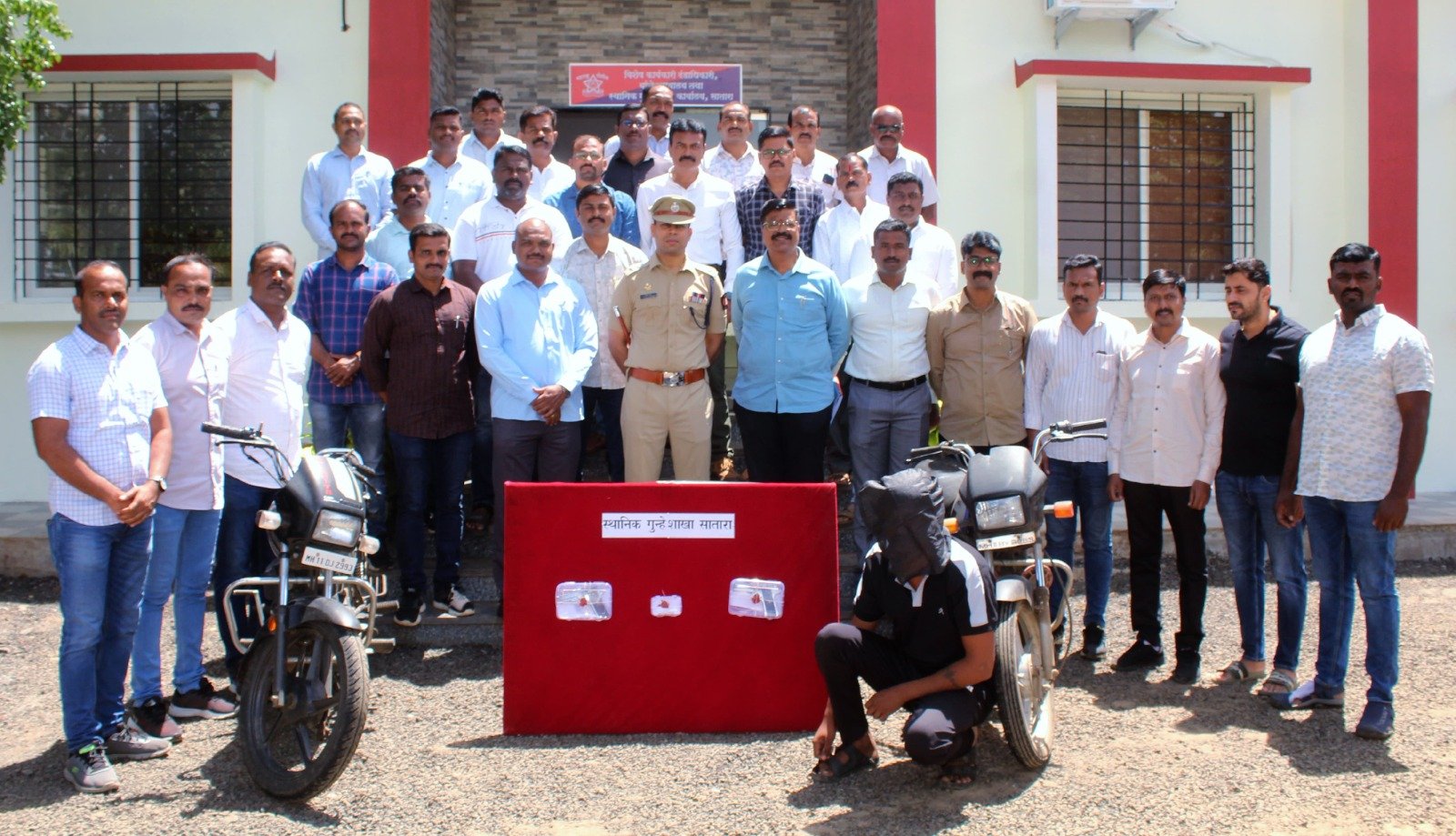 स्थानिक गुन्हे शाखेच्या पथकाने म्हसवे गावाच्या हद्दीत महामार्गाच्या पुलाखाली एका इसमावर कारवाई करून त्याच्याकडून दोन देशी बनावटीची पिस्टल, तीन जिवंत काडतुसे व दोन मोटरसायकल असा दोन लाख 25 हजार 600 रुपयांचा मुद्देमाल जप्त केला आहे. या कारवाईमध्ये बाकीचे संशयित अंधाराचा फायदा घेऊन पळाले. स्थानिक गुन्हे शाखेच्या पथकाने कोंबिंग ऑपरेशन दरम्यान ही कारवाई केली.