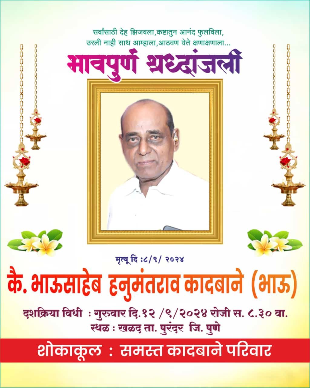 सातारा : गुरुवार दि. 12 सप्टेंबर रोजी कै. भाऊसाहेब हनुमंतराव कादबाने उर्फ भाऊ यांचा दशक्रिया विधी खळद, तालुका पुरंदर, जिल्हा पुणे येथील कऱ्हा नदीच्या काठी सकाळी 8.